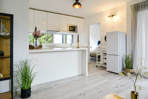Koupelna, kuchyňská linka, podlahy a interiérové prvky součástí standardu
