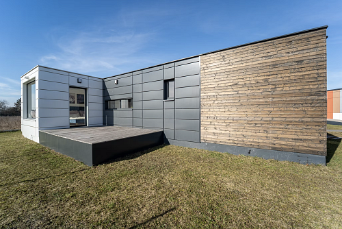 Dům je postaven na samonosné ocelové konstrukci v kombinaci se dřevem, což zajišťuje pevnost, dlouhou životnost a zároveň efektivní výrobu i instalaci. Použité materiály odpovídají současným požadavkům na nízkoenergetické bydlení, což se pozitivně promítá do provozních nákladů i celkového komfortu.